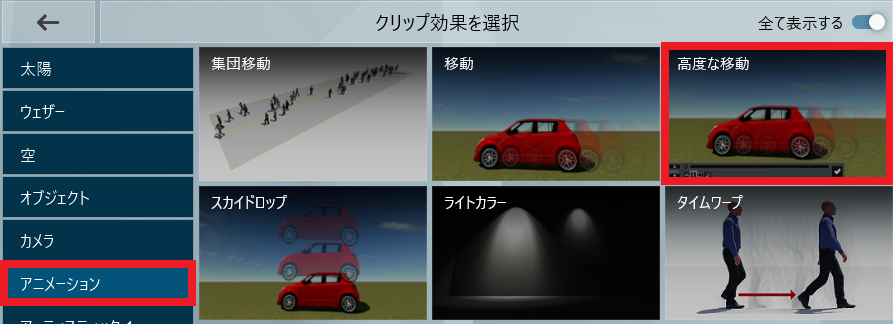 1.3:ムービーモードで「高度な移動」エフェクトをクリップに追加します。