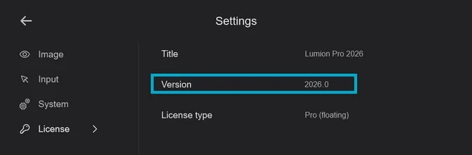 Lumionのバージョンを確認するには、設定 > ライセンス に移動してください: