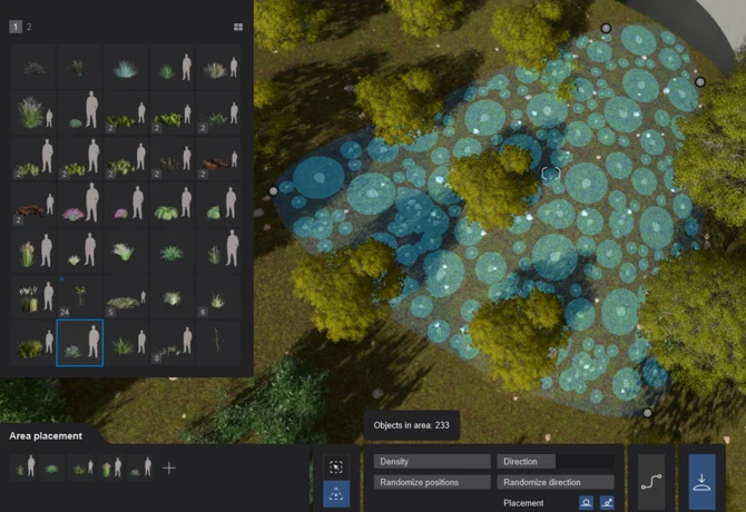 新しいエリア配置ツールを使用すると、広大な屋外空間に複数の異なるオブジェクトを一度に配置しながら、配置の分散やバリエーションを高度に制御できます。