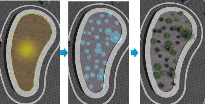 このツールは、混合植生、低木、樹木、地被植物などを自然な変化と最小限の繰り返しで配置するなど、造園ワークフローに特に役立ちます。