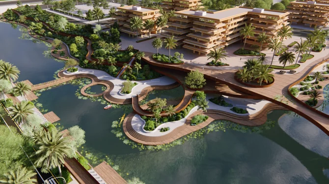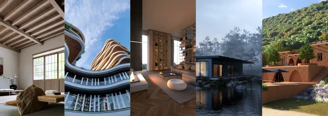 日本風の内装、有機的な形状の流れるような高層ビル、モダンなアパート、湖畔のリトリート、地中海風の別荘です。