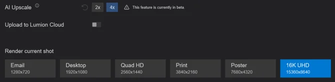 Lumionは印刷解像度で画像をレンダリングした後、16Kにアップスケールします。