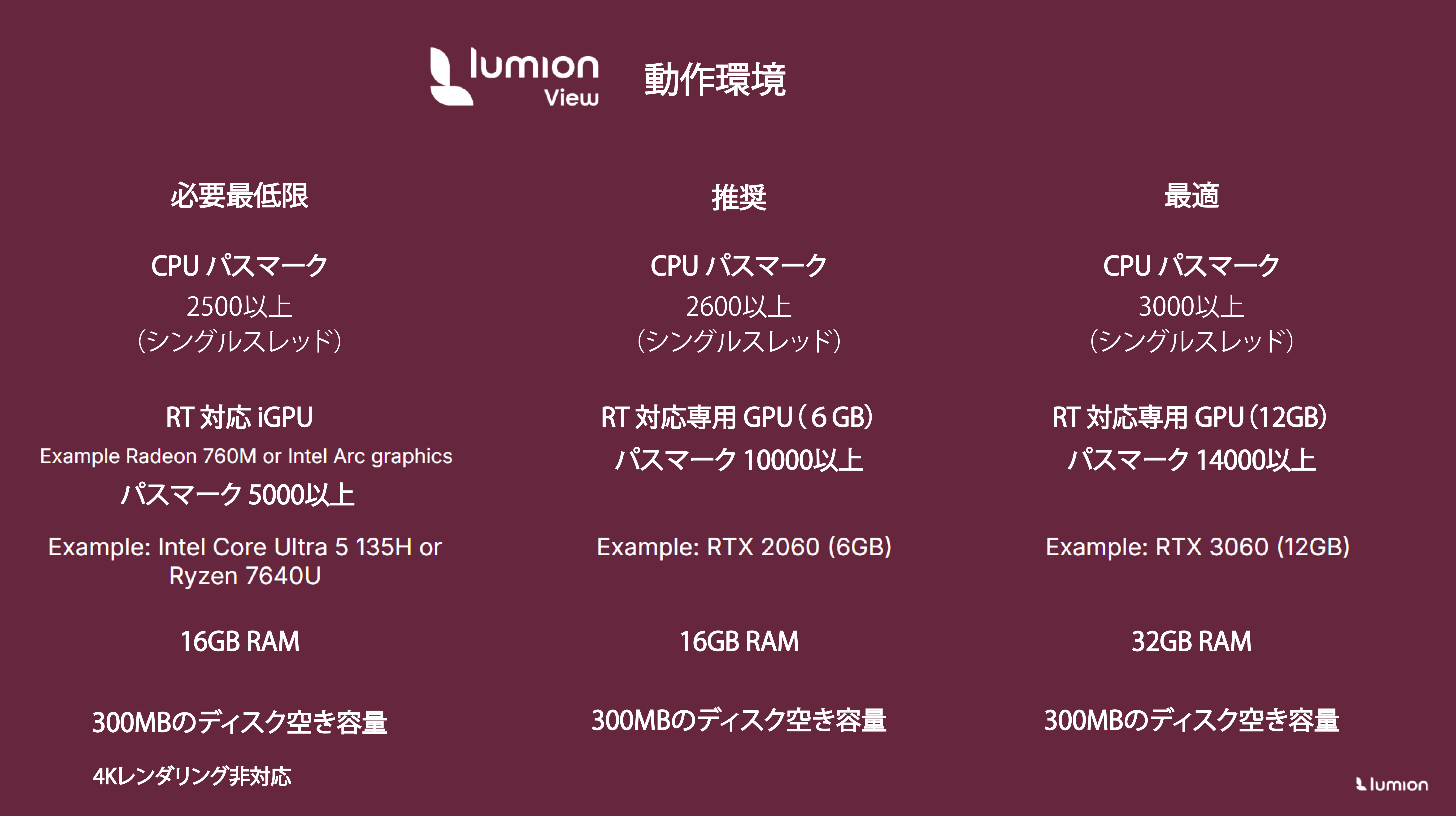 Lumion Viewはパストレーシングエンジン上に構築されているため、レイトレーシング機能が必要です。